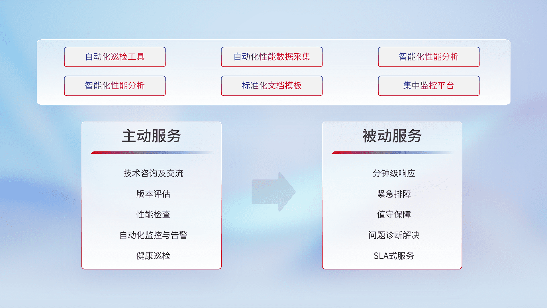 智能化工具和标准化文档,,,,保障服务质量,,,,提供主动服务(包含技术咨询、、、、版本评估、、、、性能检查、、、、自动化监控与告警、、、、健康巡检)和被动服务包含(分钟级响应、、、、紧急排障、、、值守保障、、、问题诊断解决、、、、SLA服务)。。。。